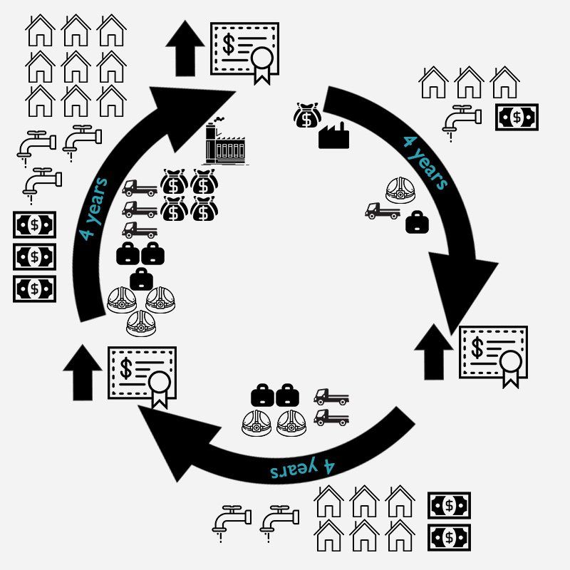 The Town did the same thing as the "Even Keel Model", to a "T". But then, after 4 years, the Town administration changes, and they decide "hey, let's quickly ramp up the number of residential communities that we have! It will make it so we receive more water revenues, meaning quicker infrastructure projects, that are bigger, badder, and bolder. And it will mean more taxable revenue, since we have more homes! Also, it will mean that our bond ratings will increase meaning we can receive debt easier and issue more of it to pay for things!"