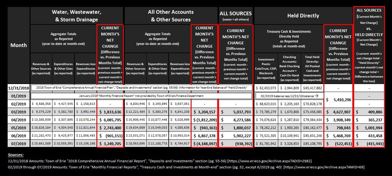 So, to best show the Town’s “cash flow” in the best method possible, the graphic seen below shows the complete amount of total “liquid” funds reported and “Held Directly” by the Town. These amounts are “as reported” by the Town, based on the Town’s 2018 CAFR, as well as each following month’s Monthly Financial Report (except January 2019, since a Monthly Financial Report was not provided by the Town). This graphic represents all “liquid” funds controlled by the Town, from December 31, 2018 through July 31, 2019, showing exactly how and where these funds were either received or expended.