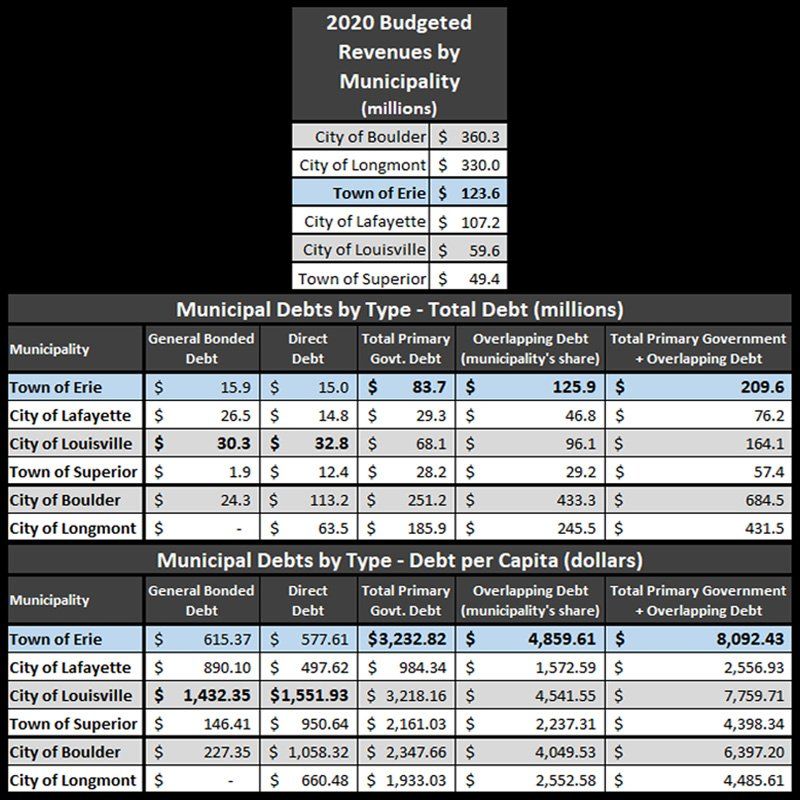 I also issued an infographic which showed just how much debt the Town has incurred. The information I presented highlights the fact, that relative to all of the largest municipalities within Boulder County, the Town of Erie has more "Total Primary Government and Overlapping Debt per Capita" than any other municipality, and also has more revenues and debt than any other town, except for the largest 2 cities of Boulder and Longmont (which is expected from municipalities of their size, since they do also have very specific bonds which are repaid solely from sales taxes, and are able to repay the bonds in a fairly short amount of time due to their large revenue base).