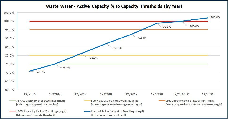 For starters, every piece of infrastructure within the Town should be monitored based on active levels and capacity thresholds or limits. For example, in the situation of Erie's North Water facility expansion mentioned earlier, town staff should have been actively monitoring the capacity limits better, identifying precisely when